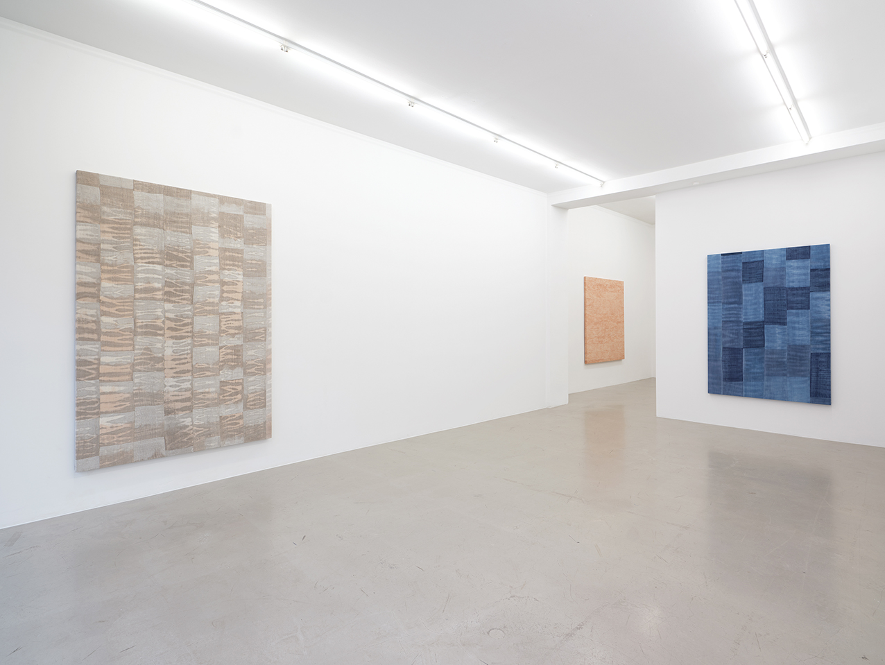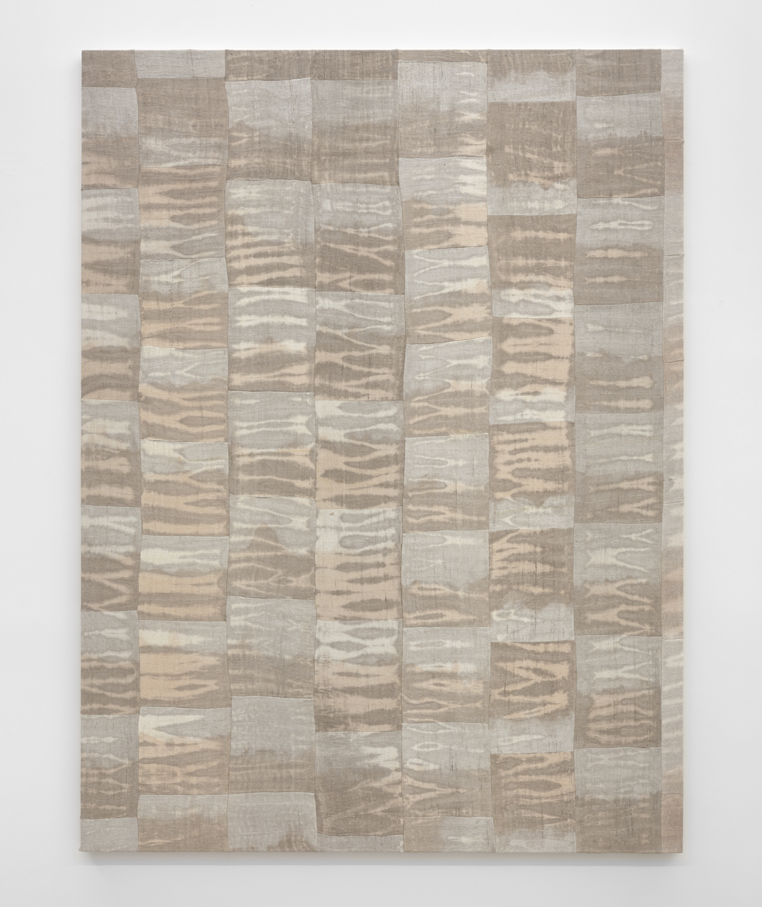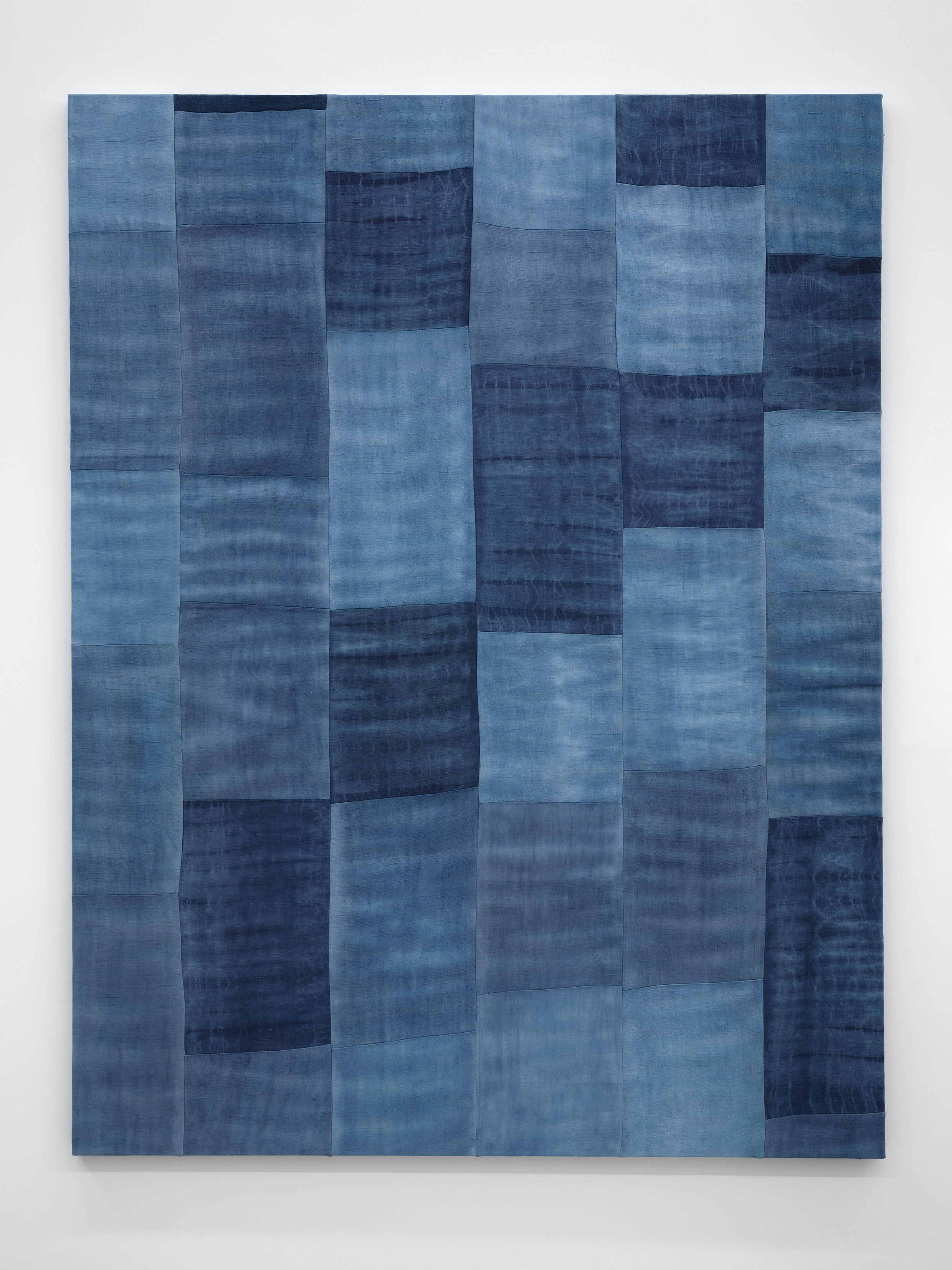 How do we define a place? Ayan Farah’s work is marked by her deep interest in the geographical and geopolitical characteristics of the places she spends time in, most recently Sweden, Senegal and England. In these places, she collects minerals, soil or plants such as indigo, which she later uses in her studio to produce pigments for dyeing. The “pictorial ground” always consists of historical textiles from the 18th and 19th centuries, which Ayan Farah cuts up into individual fragments for dyeing and later sews together again by hand and machine to form strict compositions. During the dyeing process, the textiles become “ vessels” of the geographical characteristics of certain places as well as their socio- and geopolitical characteristics. At the same time, the textiles are “places of memory” of the stories of their former owners, often “marked” by hand-embroidered initials that refer to past times as an “index” and now become part of Ayan Farah’s works. This “cyclical” approach to textiles, which is currently finding expression in pop culture in the form of “recycled fashion”, is based on Ayan Farah’s biographical roots in Somalia where the collection and processing of textiles with hand embroidery has been practiced by her family. Ayan Farah’s keen eye for the availability of natural resources is also based on the fact that her ancestors were nomads who, depending on water and natural resources, moved from place to place and adapted their way of life to their immediate surroundings.